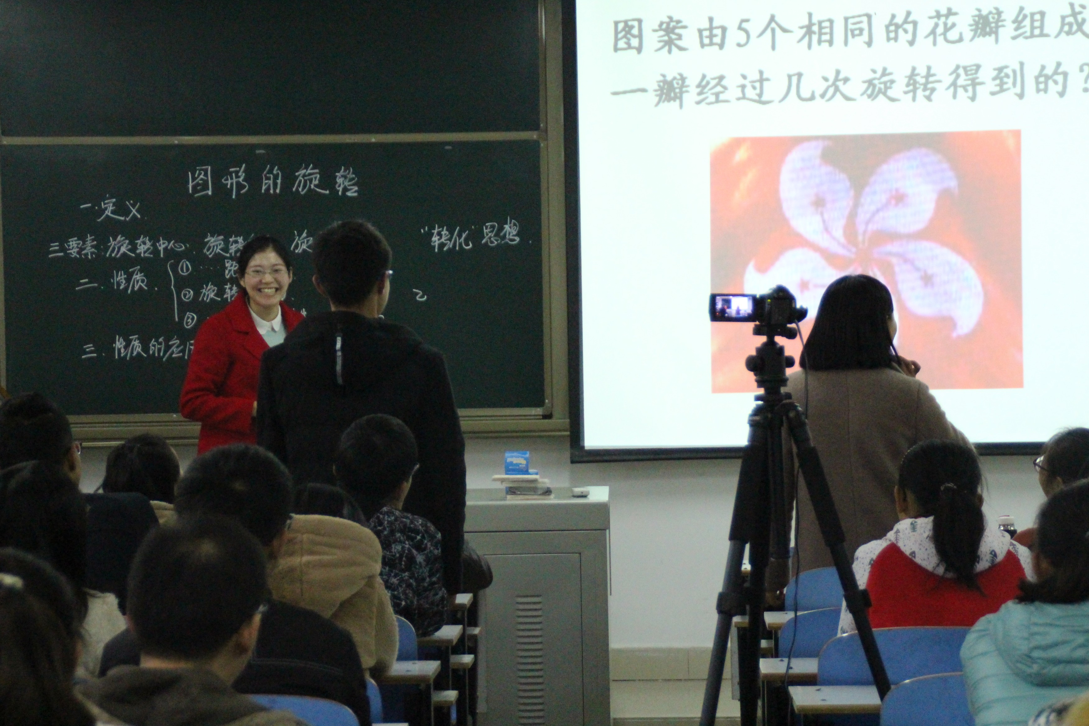 本次名师讲堂主题是图形的旋转,帅玉芹老师从图形旋转的定义、图形旋转的性质及应用浅入深清晰地讲授了图形的旋转。整节课教学思路清晰,重点突出,教学方法新颖独特,充分调动学生学习与思考的积极性,课堂气氛活跃,富有激情和感染力,受到在场教师学生高度好评。