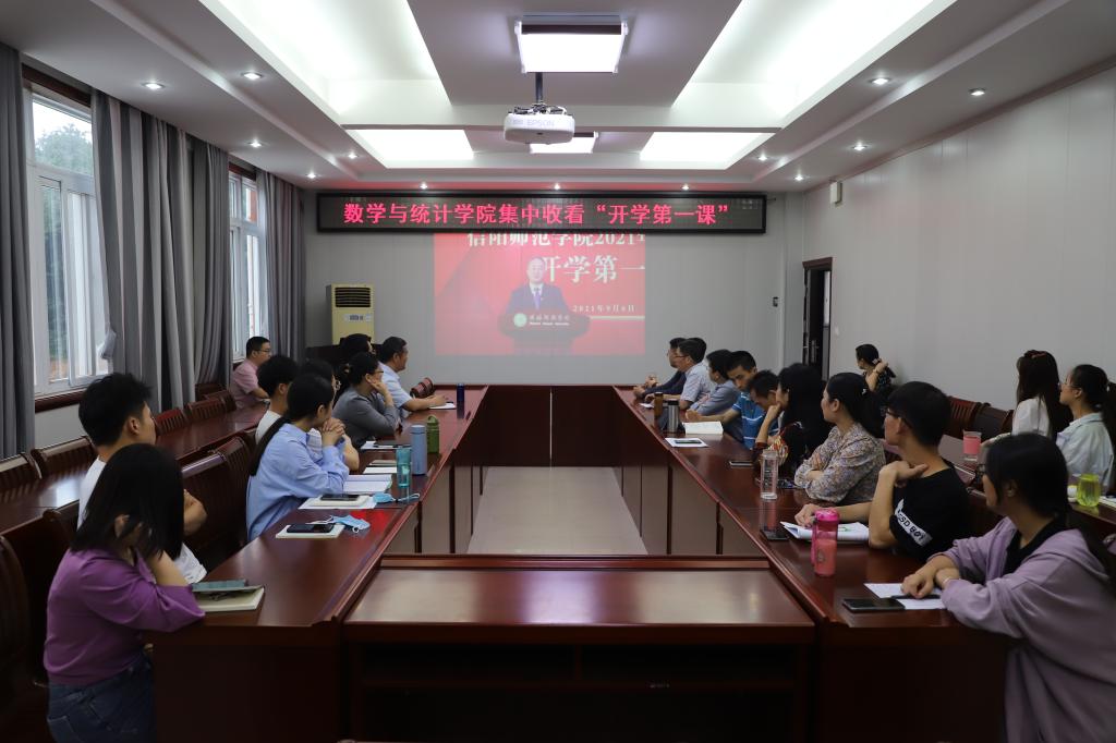 为贯彻落实河南省委和省教育厅疫情防控有关要求,持续深入开展“把灾难当教材 与祖国共成长”主题教育活动,按照信阳师范学院《关于做好2021-2022学年第一学期本科课程线上教学工作的通知》要求,加勒逼 9月6日上午8:00—10:00通过超星网络平台组织全院师生同上《开学第一课》。学院领导班子成员、系(副)主任、中心(副)主任、教研室主任、班主任等老师在数学楼315会议室集中观看了开学第一课。