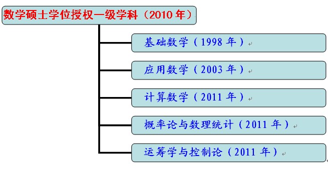 1998年经国务院学位委员会批准,基础数学学科获得硕士学位授予权,也是信阳师范学院第一个硕士学位授权点,2003年应用数学学科获得硕士学位授予权。2010年数学学科被遴选为硕士学位授权一级学科,2011年经校学位委员会批准,基础数学、计算数学、概率论与数理统计、应用数学、运筹学与控制论五个专业均取得硕士研究生招生和硕士学位授权资格。