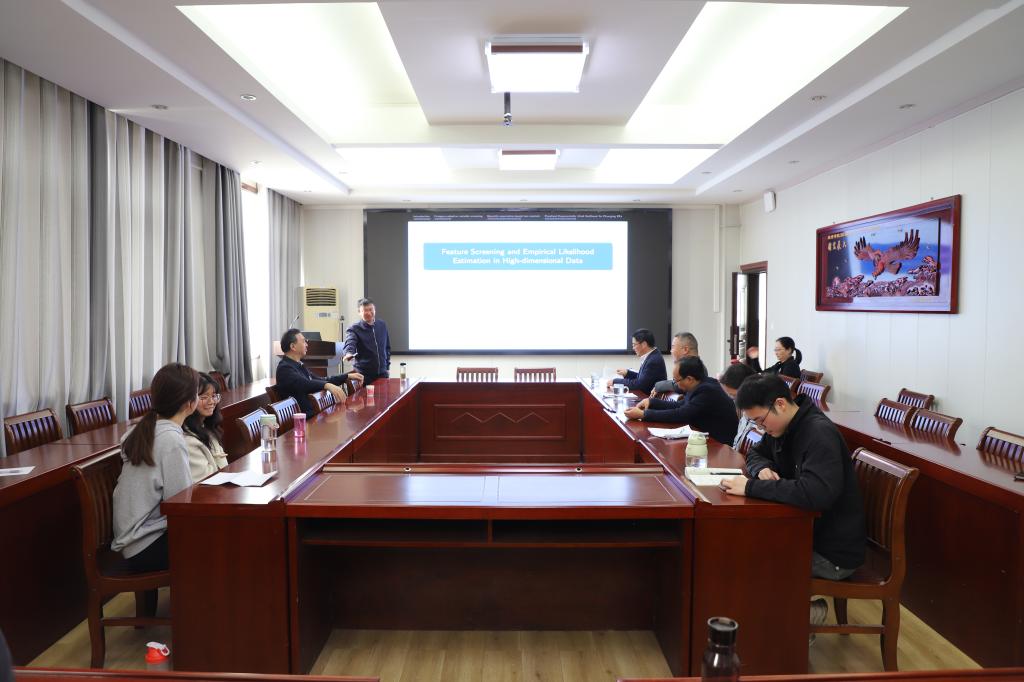 4月7日上午,应加勒逼 邀请,云南大学唐年胜教授在数学楼315会议室做了题为《Feature screening and Empirical likelihood estimation in Ultrahigh-dimensional》的学术报告。报告会由院长蔡礼明教授主持,副院长韩英波教授、部分老师及研究生聆听了此次报告。
