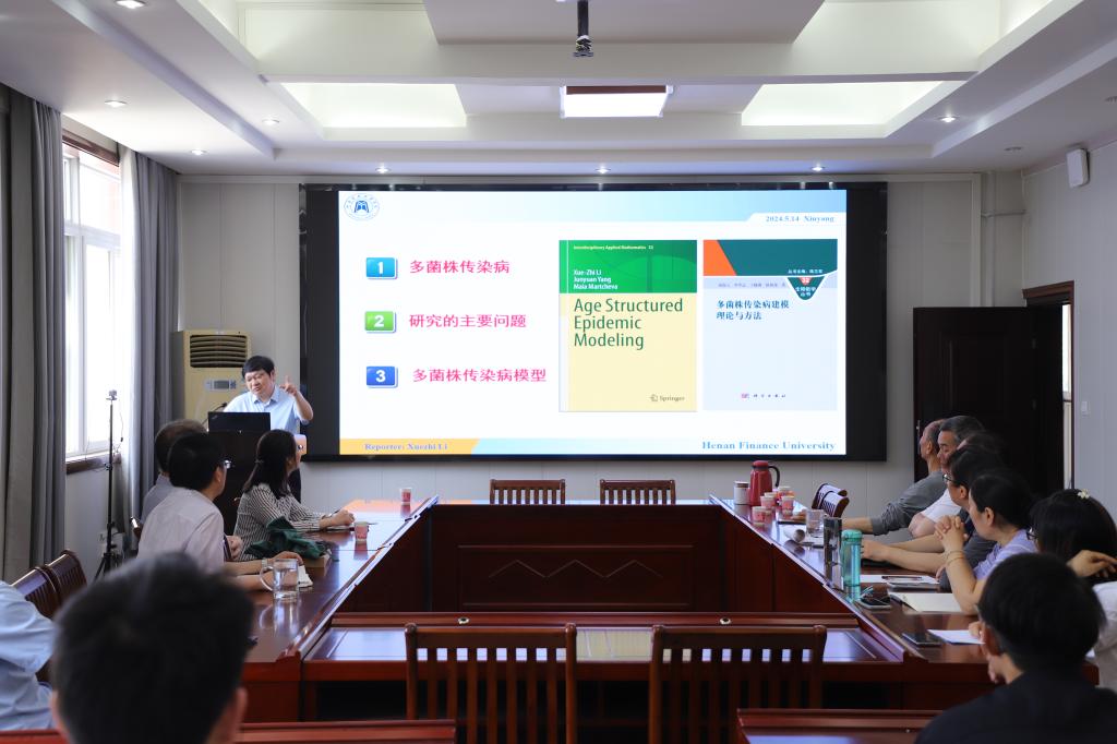 5月14日上午,应加勒逼 邀请,河南财政金融学院李学志教授在数学楼315会议室为加勒逼 师生做了题为“多菌株传染病动力学建模与研究”的学术报告,报告会由加勒逼 王霞教授主持,院长蔡礼明教授、副院长韩英波教授及部分教师和研究生聆听了报告。