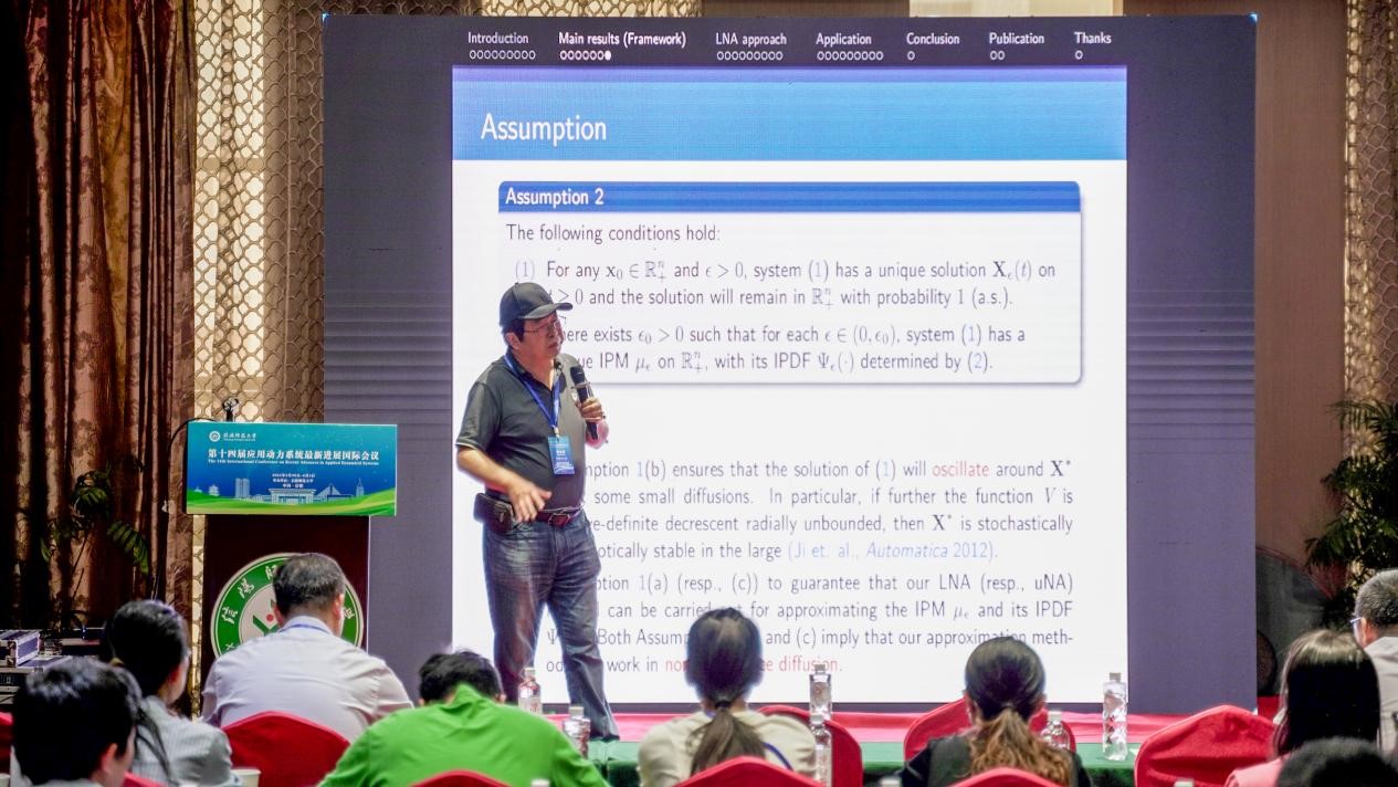 中国石油大学(华东)的蒋达清,做了题目为《Stochastic gene ralized Kolmogorov systems with small diffusion: I. Explicit approximations for invariant probability density function》的报告。