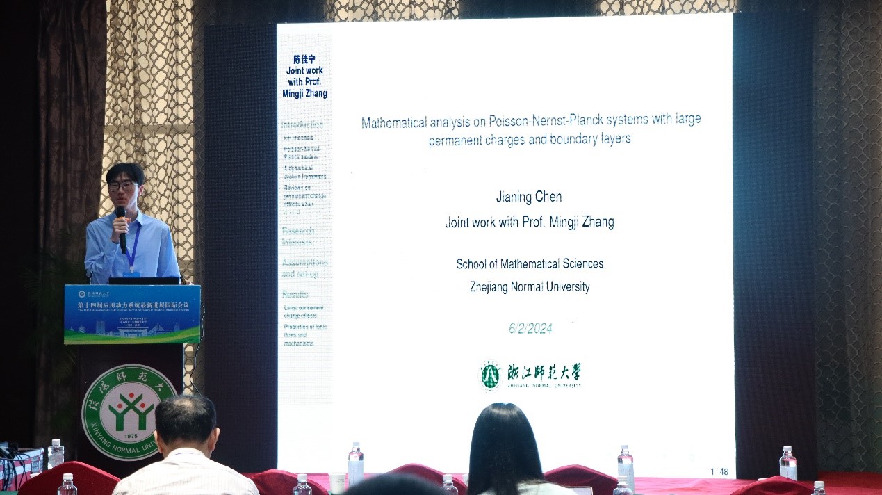 浙江师范大学的陈佳宁,做了题目《Mathematical analysis on Poisson-Nernst-Planck systems with large permanent charges and boundary layers》的报告 。