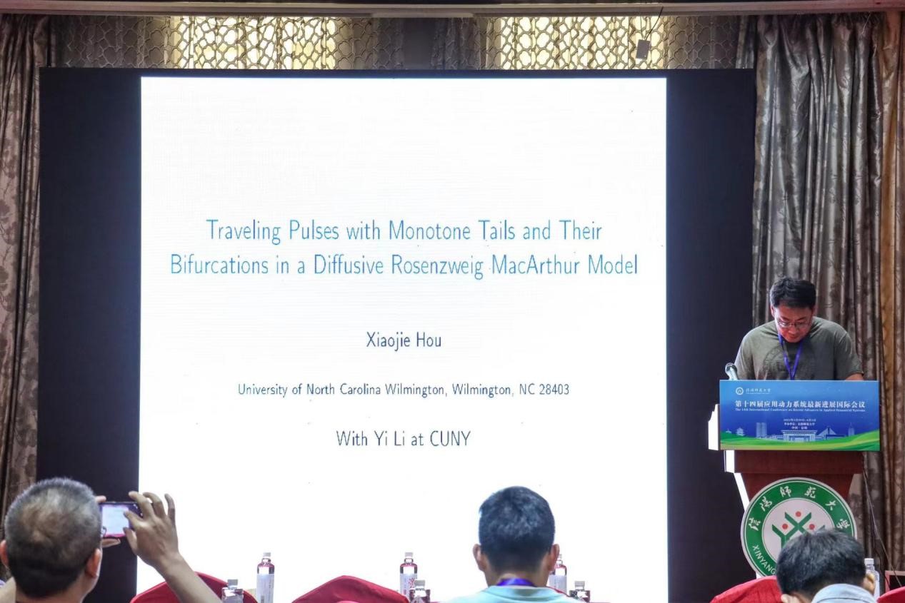 University of North Carolina Wilmington的Xiaojie Hou,做了题目为《 Traveling Pulses and their Bifurcation in a Diffusive Rosenzweig-MacAuthur Model》的报告。