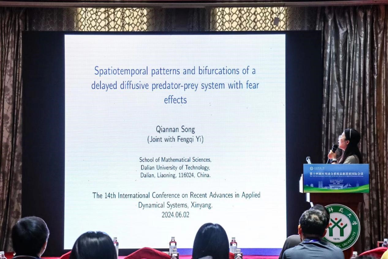 大连理工大学的宋倩楠,做了题目为《 Spatiotemporal patterns and bifurcations of a delayed diffusive predator-prey system with fear effects》的报告。