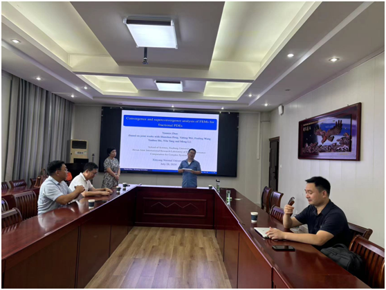 7月28日上午,应加勒逼 邀请,许昌学院赵艳敏教授作了题为《Convergence and superconvergence analysis of FEM for fractional PDEs》的学术报告。报告会由李世顺教授主持,部分老师及研究生聆听了此次报告。