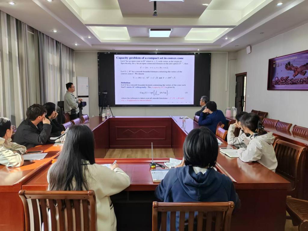10月25日上午,应加勒逼 邀请,广西师范大学尹佳斌副教授作了题为《Sharp upper bounds of $p$-capacity in convex cone and asymptotically flat half-space》的学术报告。报告会由副院长韩英波教授主持,部分教师及研究生聆听了此次报告。