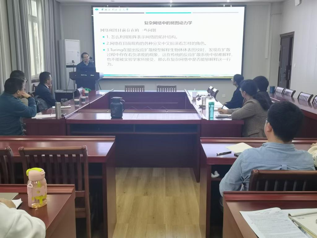 11月15日下午,应加勒逼 邀请,华北水利水电大学申建伟教授在数学楼315会议室为加勒逼 师生作了题为“生物反应扩散系统的斑图动力学”的学术报告。报告由副院长王霞教授主持,生物数学方向的老师及研究生聆听了此次报告。
