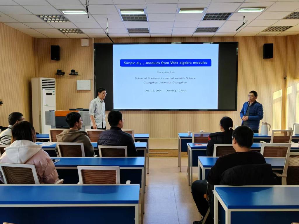 12月15日下午,应加勒逼 邀请,广州大学郭向前教授来加勒逼 为广大师生做了题为《Simple sl_d+1-modules from Witt algebra modules》的学术报告。报告会由院长蔡礼明教授主持,部分老师及研究生聆听了此次报告。