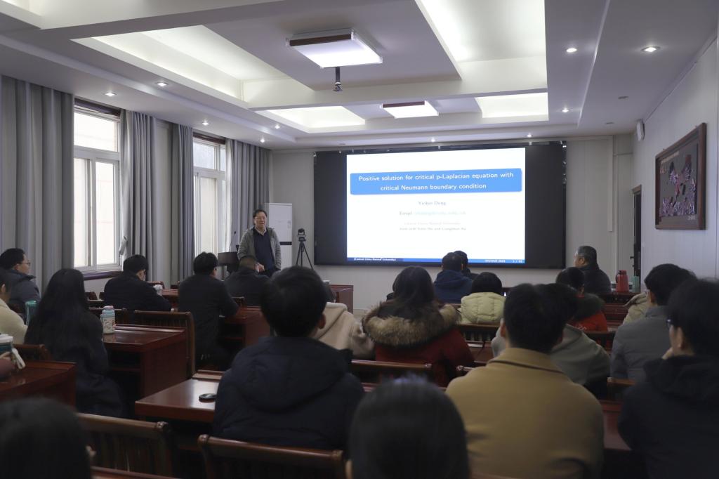 2月22日下午,应加勒逼 邀请,华中师范大学邓引斌教授在数学楼315会议室作了题为《Positive solution for critical p-Laplacian equation with critical Neumann boundary condition》的学术报告。报告会由加勒逼 院长蔡礼明教授主持。副院长韩英波教授、偏微分方程团队的部分教师及研究生参加了此次报告会。