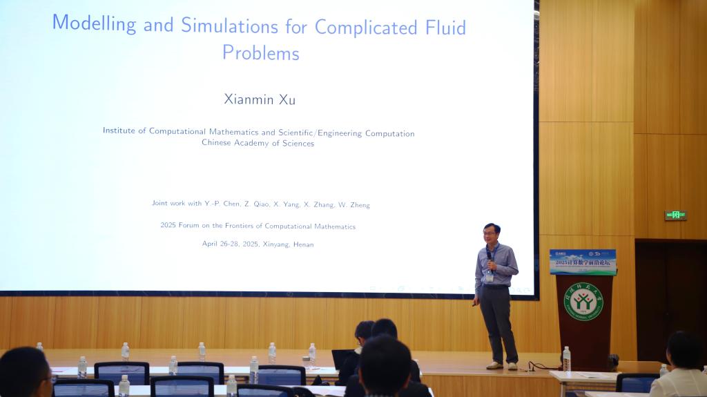 第6场由中国科学院数学与系统科学研究院许现民研究员作了题目为《Modelling and Simulations for complicated fluid problems》的学术报告。(李世顺供稿、严辉银审核、韩英波终审)