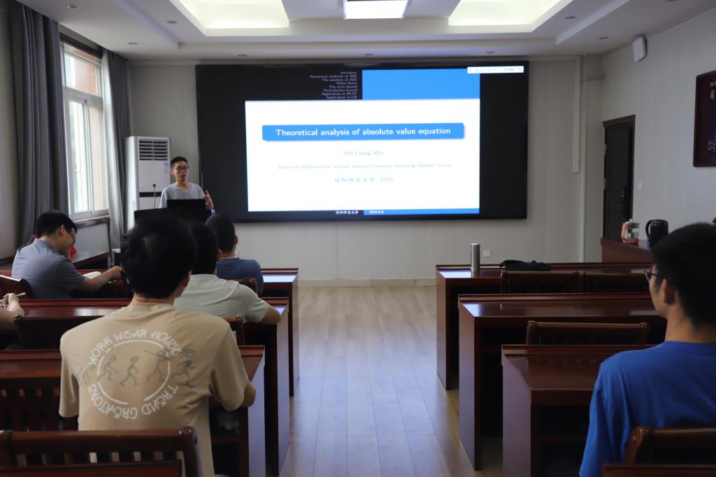 6月8日下午,应加勒逼 邀请,云南师范大学吴世良教授在数学楼315会议室作了题为 Theoretical analysis of absolute value equation》的学术报告。报告会由计算数学方向带头人李世顺教授主持,部分教师及研究生参加了此次报告会。
