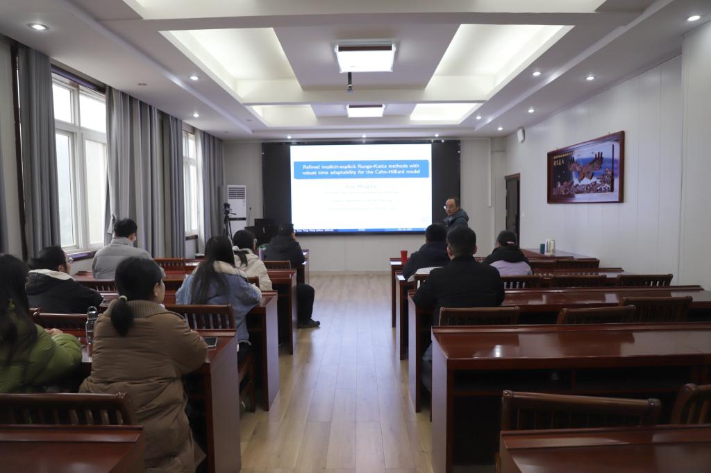 3月16日上午,应加勒逼 邀请,南京航空航天大学廖洪林教授作了题为《求解 Cahn-Hilliard 方程的自适应隐-显龙格库塔方法》的学术报告。报告会由蔡礼明院长主持,部分老师和研究生聆听了此次报告。