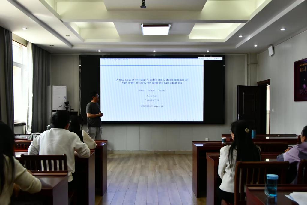 4月18日上午,应加勒逼 邀请,山东师范大学刘争光教授莅临加勒逼 ,作了题为《A new class of one-step A-stable and L-stable schemes of high-order accuracy for parabolic type equations》的学术报告。报告会由李世顺教授主持,学院部分教师及研究生到场聆听。