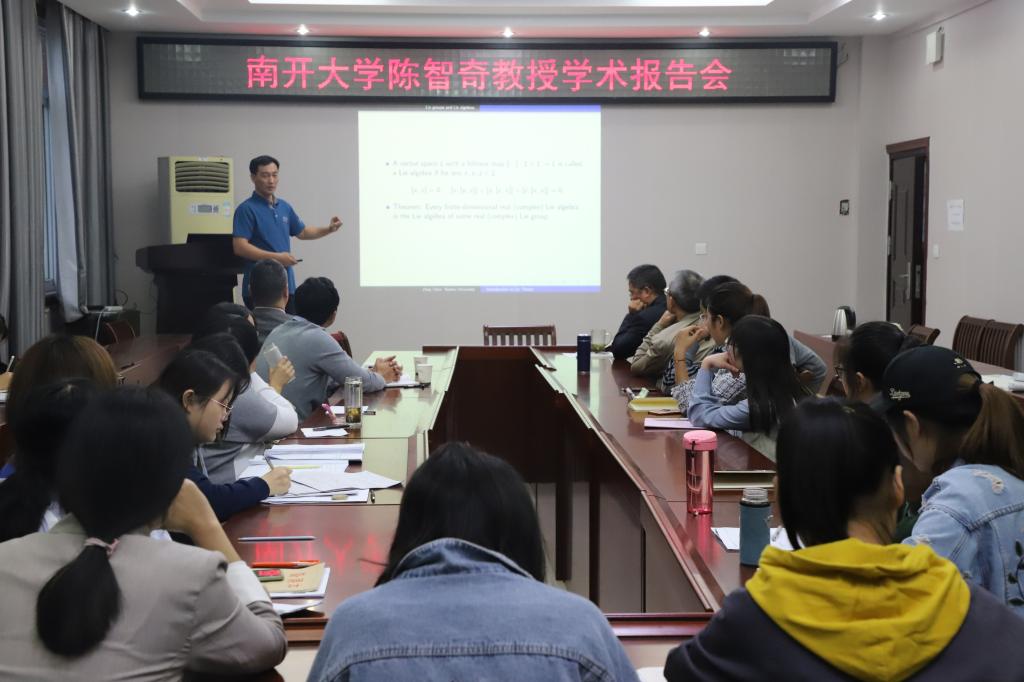 10月8日下午,应加勒逼 邀请,南开大学陈智奇教授在加勒逼 学术报告厅作了题为“李理论简介”的学术报告,报告会由加勒逼 副院长蔡礼明教授主持,加勒逼 院长胡余旺教授和部分老师及研究生聆听了报告。