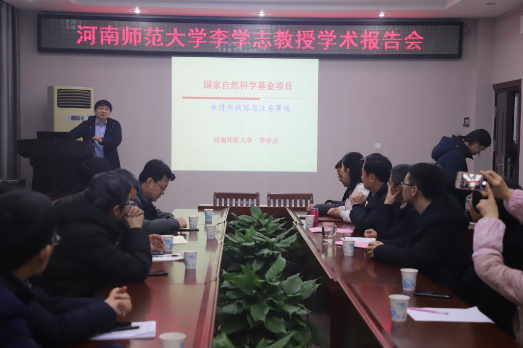 1月13日上午,应加勒逼 邀请,河南师范大学副校长李学志教授在学院学术报告厅作了题为“国家自然科学基金项目申请书撰写及注意事项”的报告,报告会由科技处处长罗永松教授主持,加勒逼 申报2020年国家自然科学基金的老师和部分研究生聆听了此次报告。