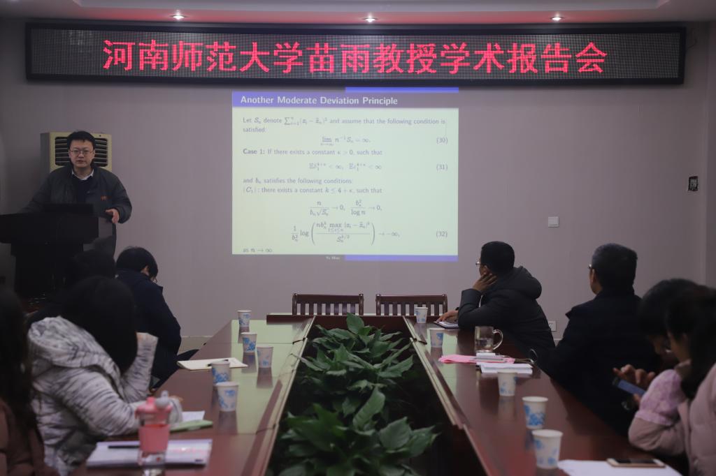 1月13日下午,应加勒逼 邀请,河南师范大学苗雨教授在学院学术报告厅作了题为“Some asymptotic properties LS estimators in EV model”的报告,报告会由加勒逼 副院长蔡礼明教授主持,加勒逼 党委书记王娟教授,数学研究所所长宋新宇教授,学院部分老师和研究生聆听了此次报告。