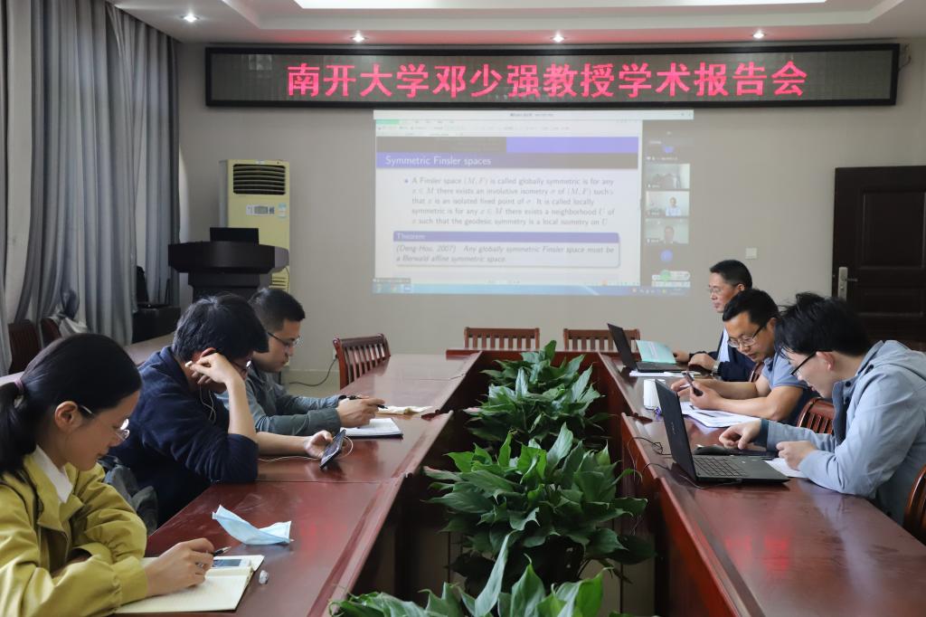 5月11日下午,应加勒逼 邀请,南开大学邓少强教授通过腾讯会议做了一场题为《On the symmetry of Riemann-Finsler spaces》的网络视频学术报告。报告会由加勒逼 副院长蔡礼明教授主持,院长胡余旺教授,学院部分老师和研究生聆听了此次报告。