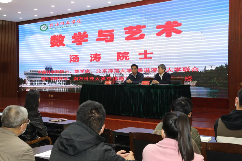 在报告中,汤涛院士通过名画《蒙娜丽莎》、巴赫古典音乐、水立方、古希腊巴特农神庙解读了绘画、音乐、建筑和雕塑等艺术中的数学;由非欧几何和分形结构展示了数学中的艺术;结合电影、绘画、3D打印,人工智能等阐述了高科技时代的数学与艺术。报告结束后,汤涛院士与现场师生进行了热烈的交流互动,耐心细致地回答了大家的提问。