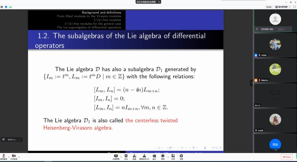 10月13日上午,应加勒逼 邀请,湖州师范学院刘东教授通过腾讯会议平台为加勒逼 研究生及相关研究方向老师作了题为《Representations of the Lie algebra of differential operators》的学术报告。报告会由加勒逼 院长蔡礼明教授主持。
