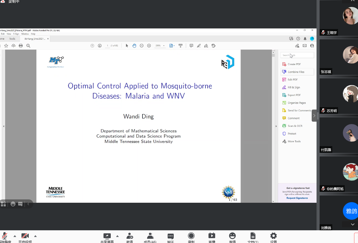 10月30日上午,应加勒逼 邀请,美国中田纳西州立大学丁婉菂教授通过腾讯会议平台为加勒逼 研究生及相关研究方向老师作了题为《Optimal control applied to mosquito-borne diseases: Malaria and WNV》的学术报告。报告会由加勒逼 院长蔡礼明教授主持。