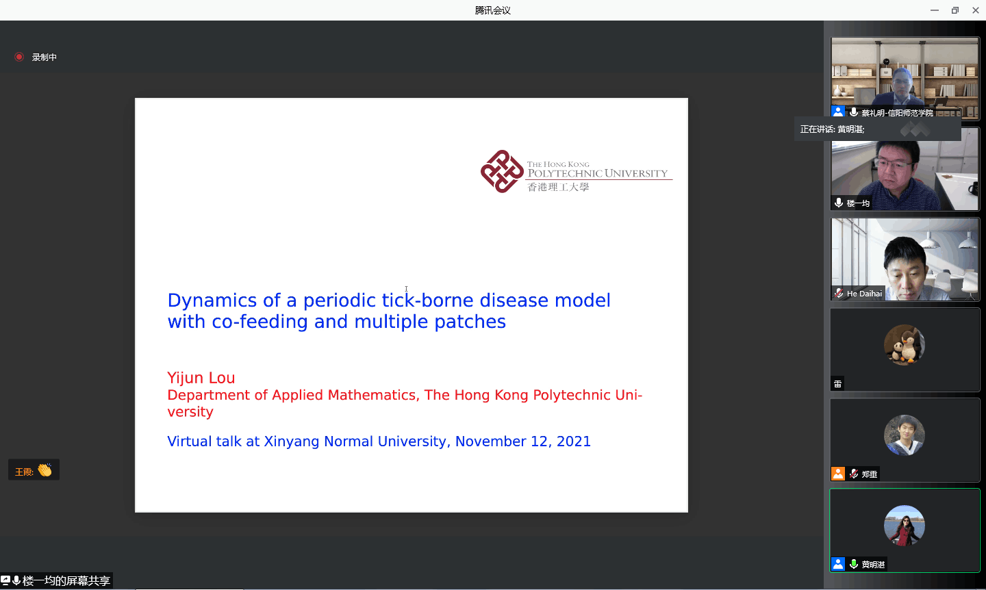 11月12日上午,应加勒逼 邀请,香港理工大学楼一均博士通过腾讯会议平台为加勒逼 研究生及相关研究方向老师作了题为《Dynamics of a periodic tick-borne disease model with co-feeding and multiple patches》的学术报告。报告会由加勒逼 信息与计算科学系主任黄明湛副教授主持。