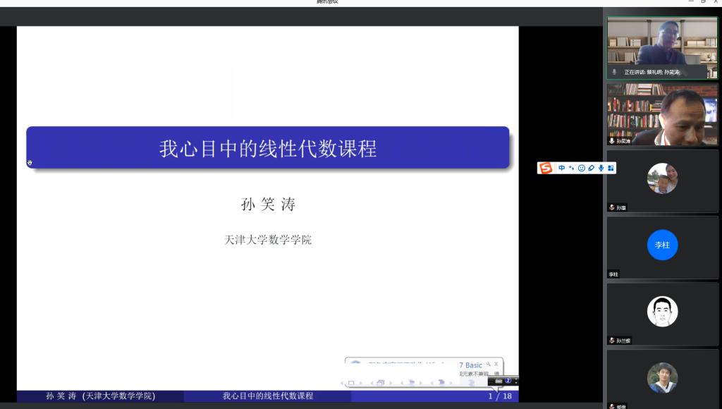 12月17日,应加勒逼 邀请,天津大学孙笑涛教授通过腾讯会议平台在线作了一场题为《我心目中的线性代数课程》的学术报告。学院部分教师和研究生聆听了此次报告。报告会由加勒逼 院长蔡礼明教授主持。