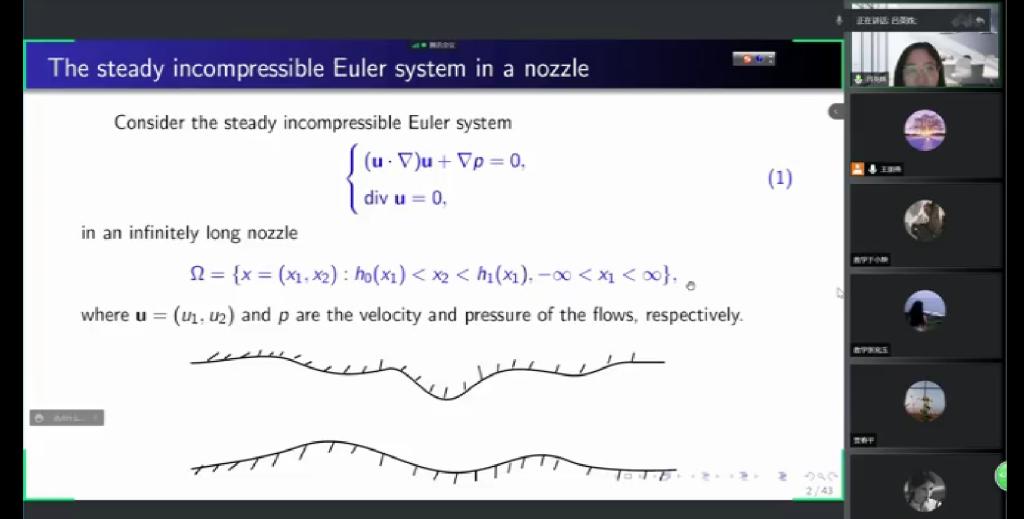 在报告中,吕英姝博士首先介绍了不可压欧拉系统的部分已有结果来引入要研究的问题,并指出流函数不具备利普希茨连续是研究该问题一个难点;然后,吕博士给出了二维无限长管道中的不可压欧拉系统的Liouville定理及证明;最后,吕博士还详细讲解了如何运用变分法证明一般的无限长管道中稳态不可压欧拉流解的存在性和唯一性。