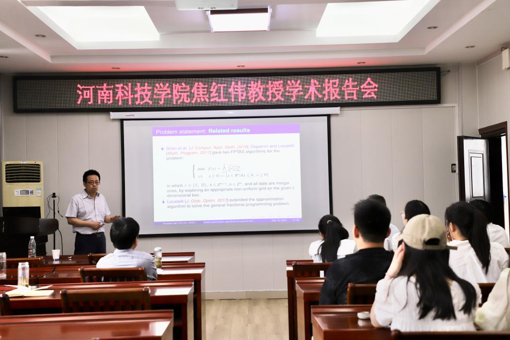 5月16日上午,应加勒逼 邀请,河南科技学院焦红伟教授在学院报告厅315作了题为“Global optimization algorithms for two classes of nonconvex programming problems”的学术报告。报告会由加勒逼 副院长韩英波教授主持,部分教师和研究生参加了此次报告会。