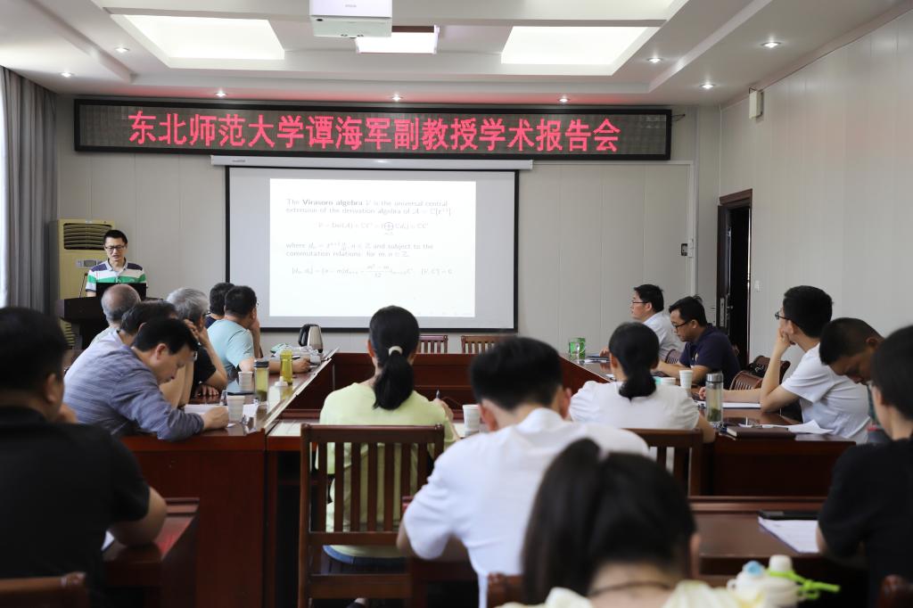 会上,谭海军副教授首先介绍了affine-Virasoro代数的相关知识背景。然后,介绍了最近在affine-Virasoro代数上取得的一些最新结果,包括一类affine-Virasoro代数的单模的分类,这类模的特点是affine-Virasoro代数的正半部分作用在模上局部有限。谭海军副教授给出了这些单模的完全分类,证明了它们要么是最高权模,要么是Whittaker 模。会后,谭海军副教授教授与参加报告的师生展开了热烈讨论,就师生所提出的问题进行了详细、全面地解答。此次报告会和交流讨论对在座的各位老师和同学们都有很大的启发,进一步激发了师生们探究代数学的兴趣和信心。