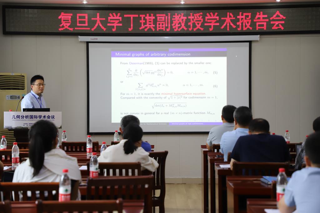 1场报告由复旦大学丁琪副教授报告,题目为《Minimal graphs of high codimensions》。在报告中,丁琪副教授讨论了欧氏空间中的高余维极小图列的极限。作为应用,得到了极小图上的刚性结果。
