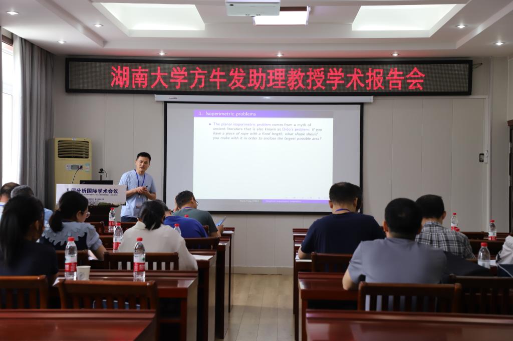 3场报告由湖南大学方牛发助理教授报告,题目为《The weighted isoperimetric inequalities》。在报告中,方牛发助理教授首先综述了加权等周不等式的最近研究结果。重点讨论了关于加权质心体的加权等周不等式。