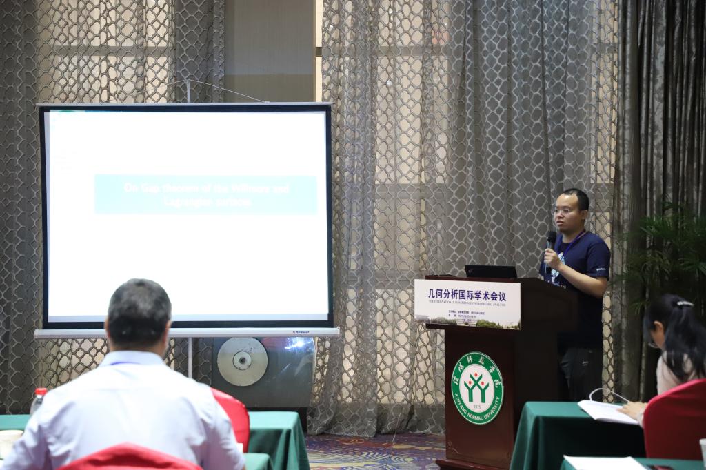 4场报告由重庆理工大学张柳阳博士报告,题目为《On Gap phenomenon of Lagrangian and Willmore surfaces》。在报告中,张柳阳博士综述了Willmore 泛函和Lagrangian 曲面研究的一些进展,重点讨论了Whitney 球面的间隙定理。