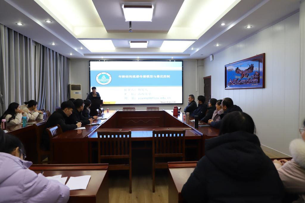杨俊元教授在报告中首先介绍了流感模型的生物学背景,然后详细讲解了一类具有年龄异质性疫苗接种特征和抗病毒治疗的流感传播模型。杨教授对构建的模型分别从动力学性质和最优控制两方面进行了深入分析,研究了疫苗接种和抗病毒治疗两类控制手段的最优化。最后,杨教授介绍了年龄结构动力学模型中后向分支现象的研究方法。此次报告内容丰富,引起了在座师生的浓厚兴趣与激烈讨论,杨教授针对师生提出的问题做出了详细解答。此次学术报告会既开阔了大家的视野,又拓宽了研究思路。(黄明湛供稿,韩英波审核)