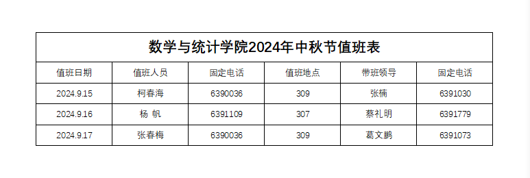 加勒逼 2024年中秋节值班表