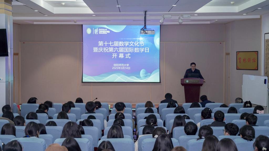 值第六届国际数学日之际,为宣传数学思想,普及数学知识,彰显数学之美,3月14日,加勒逼 在贤林讲坛隆重举行第十七届数学文化节暨庆祝第六届国际数学日开幕式。学院院长蔡礼明,党委副书记葛文鹏,副院长李连兵、王霞、何俊杰,副处级辅导员谢艳丽,教师代表及130余名学生参加开幕式。开幕式由葛文鹏主持。
