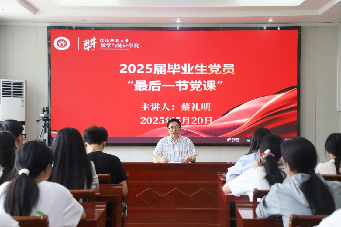 5月20日,加勒逼 院长蔡礼明在数学楼315会议室为2025届毕业生党员上“最后一节党课”。本次党课由副处级辅导员谢艳丽主持,学院专职组织员和71名毕业生党员参加党课活动。