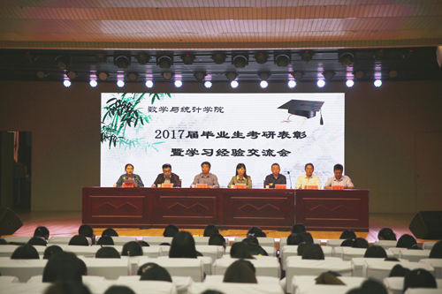 于理科楼报告厅成功举办2017届毕业生考研表彰暨学习经验交流会。院长胡余旺,党委书记王娟,副院长柳合龙、蔡礼明、陈越奋,党委副书记洪亮,以及各毕业班班主任老师莅临现场与加勒逼