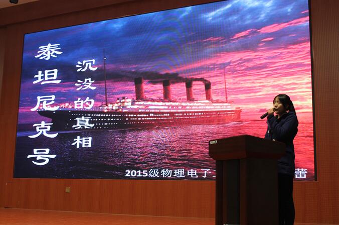 经过初赛、复赛的激烈角逐,共有来自数学学院、文学院、物电学院的五名选手脱颖而出挺进决赛。比赛在动感炫酷的舞蹈中拉开帷幕。选手们结合精心制作的ppt声情并茂的演说,为观众带来一场精妙绝伦的视听盛宴。选手吕珊童以“那些年我们追过的剧”引出话题,从不同角度对喜剧《武林外传》中的人物命运变化进行剖析,映射出要把握机遇、奋发图强、活在当下的人生哲理;选手马俊豪从一面柏林之墙导致东德与西德形成巨大文化、经济差异,联想到我国封建之墙对人性的禁锢,引导大家思考真正的自由,打破枷锁勇敢逐梦,铿锵有力的话语发人深省;选手禄浩然通过视频短片再现天津塘沽大爆炸时最帅的“逆行”,讲述了消防官兵的英雄事迹,并表示定会向他们看齐,坚定所想,实践所行。演讲最后,她深情朗读消防员袁海的最后一封家书,低沉沙哑的声音、舒缓凄美的音乐,令在场观众潸然泪下。比赛中穿插互动环节,在场观众踊跃参与到趣味数学题竞答中,现场气氛活跃。最终,来自数学学院的3号选手禄浩然凭借精彩的表现斩获一等奖。