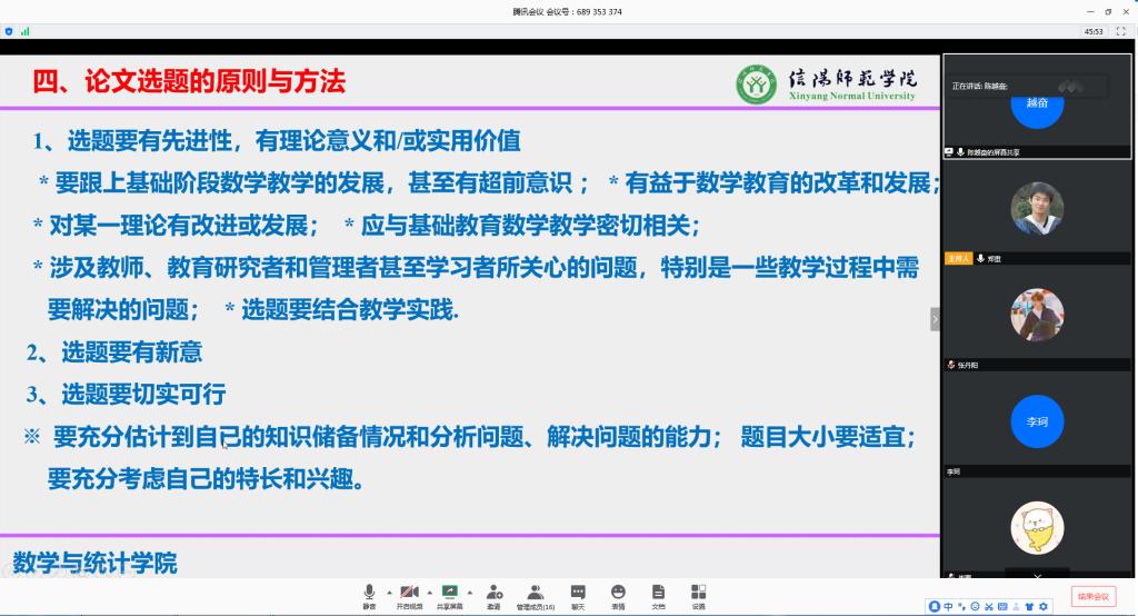 为提高教育硕士培养质量,减轻新冠肺炎疫情对学科教学(数学)专业研究生培养工作的影响。加勒逼 自5月开始,面向2019级教育硕士,通过腾讯会议平台举办了9场教育硕士线上读书报告会,取得了较好的培养效果。