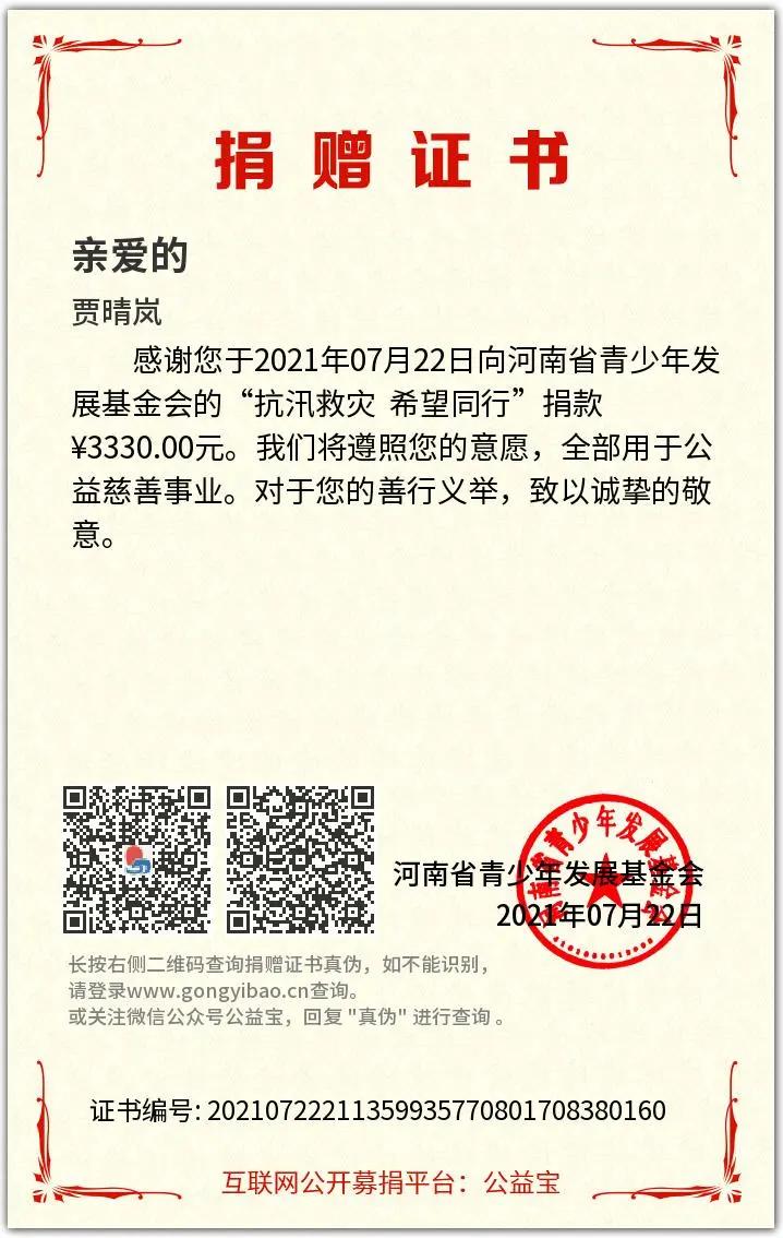 贾晴岚,加勒逼 2018级学生,中共预备党员,原学院学生会执行主席。看到受灾地区物资告急和募捐倡议书,贾晴岚没有犹豫,第一时间将自己的奖学金、比赛奖金和积攒的零花钱,共计3330元,全数捐给河南省青少年发展基金会。这笔钱原本是用来交学费的,对此,她说:“学校给我们奖学金是鼓励我们好好学习,回馈社会,成为对国家有用的人,这个时候,灾区人民比我更需要它。”