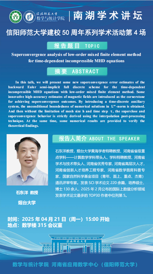 庆建校50周年之南湖讲坛: 烟台大学石东洋教授——Superconvergence analysis of low-order mixed finite element method for time-dependent incompressible MHD equations