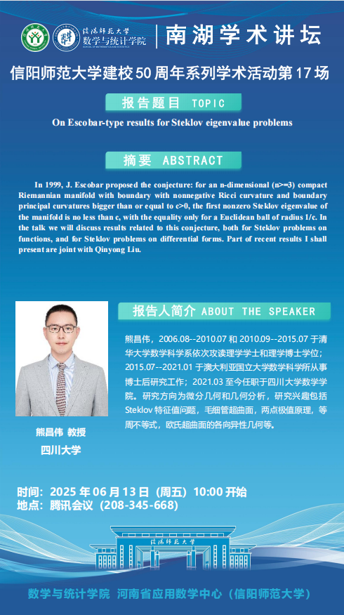 庆建校50周年之南湖讲坛:四川大学熊昌伟教授——On Escobar-type results for Steklov eigenvalue problems