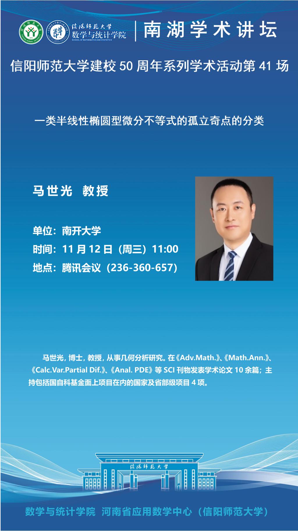 庆建校50周年之南湖讲坛:南开大学马世光教授——一类半线性椭圆型微分不等式的孤立奇点的分类