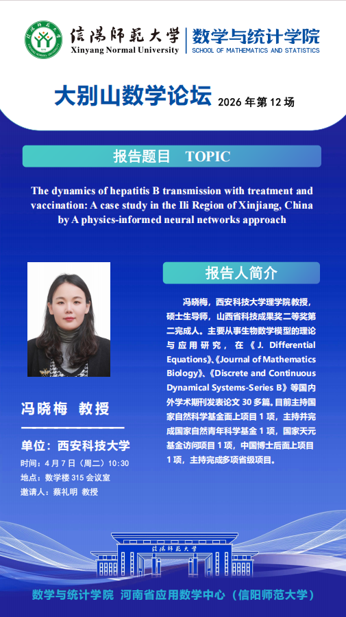 大别山数学论坛:西安科技大学冯晓梅教授——The dynamics of hepatitis B transmission with treatment and vaccination: A case study in the Ili Region of Xinjiang, China by A physics-informed neural networks approach