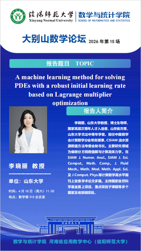 大别山数学论坛:山东大学李晓丽教授——A machine learning method for solving PDEs with a robust initial learning rate based on Lagrange multiplier optimization