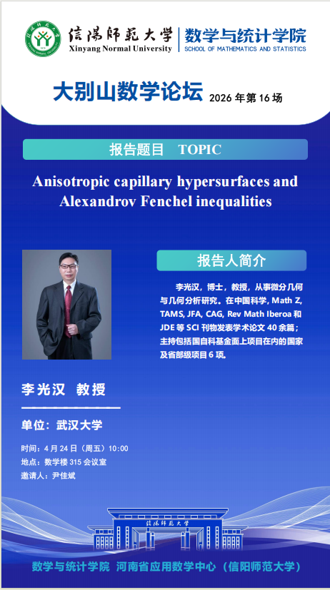 大别山数学论坛:武汉大学李光汉教授——Anisotropic capillary hypersurfaces and Alexandrov Fenchel inequalities
