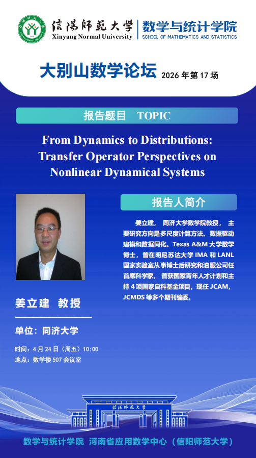 大别山数学论坛:同济大学姜立建教授——From Dynamics to Distributions: Transfer Operator Perspectives on Nonlinear Dynamical Systems