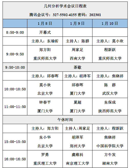 为了加强几何分析领域专家学者的学术交流与合作,推动加勒逼 数学学科的建设和发展,我们定于2023年1月8日-10日举办“几何分析学术会议”(腾讯会议)。本次会议邀请了十多位几何分析和多复变领域的知名学者,会议将展示该领域的最新研究成果和动态,并为有关专家学者和研究生提供一个相互学习和交流的平台。欢迎师生积极参与。会议日程简表如下: